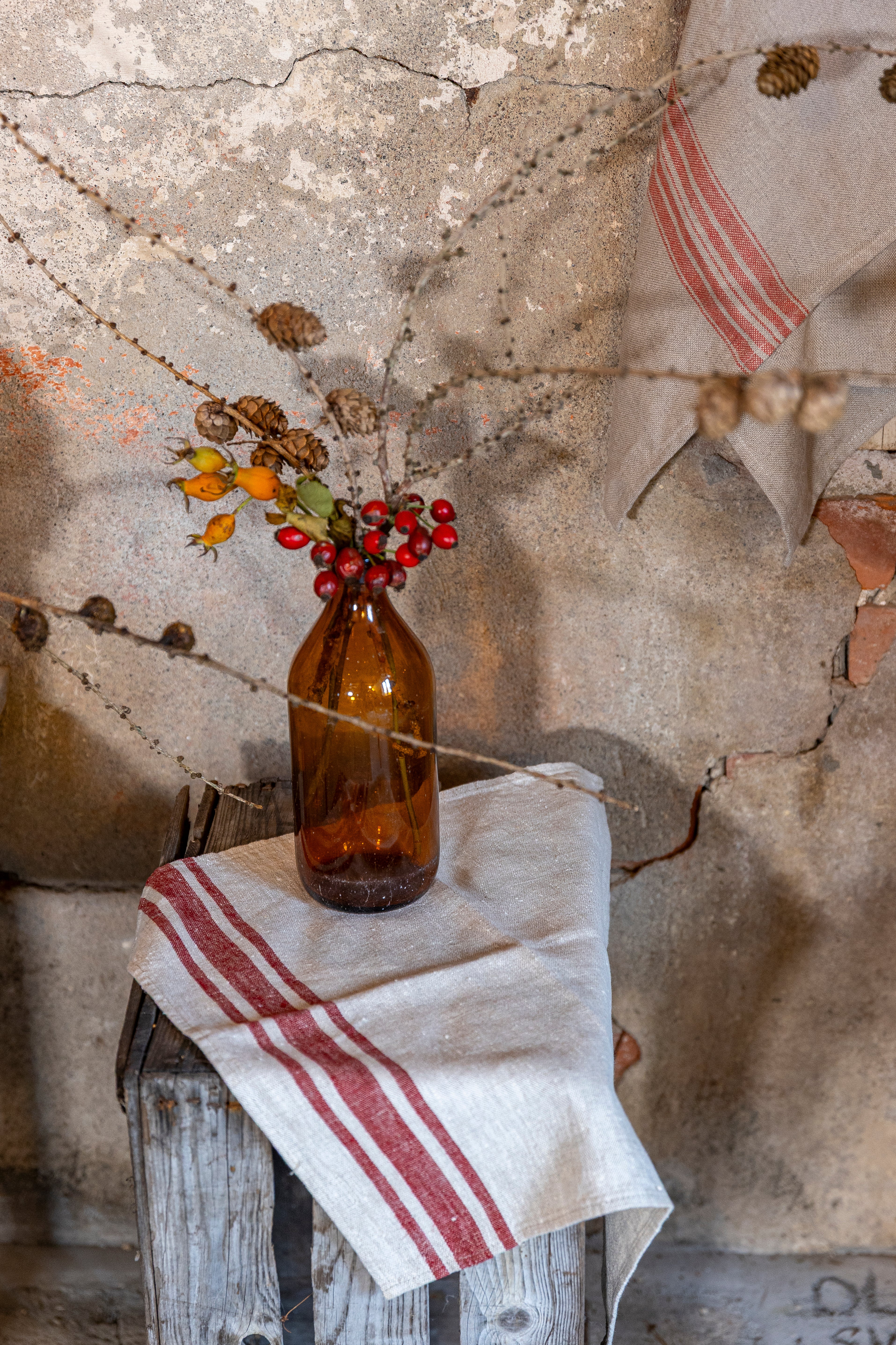 Vakker linfarget linserviett med kirsebærrøde striper.